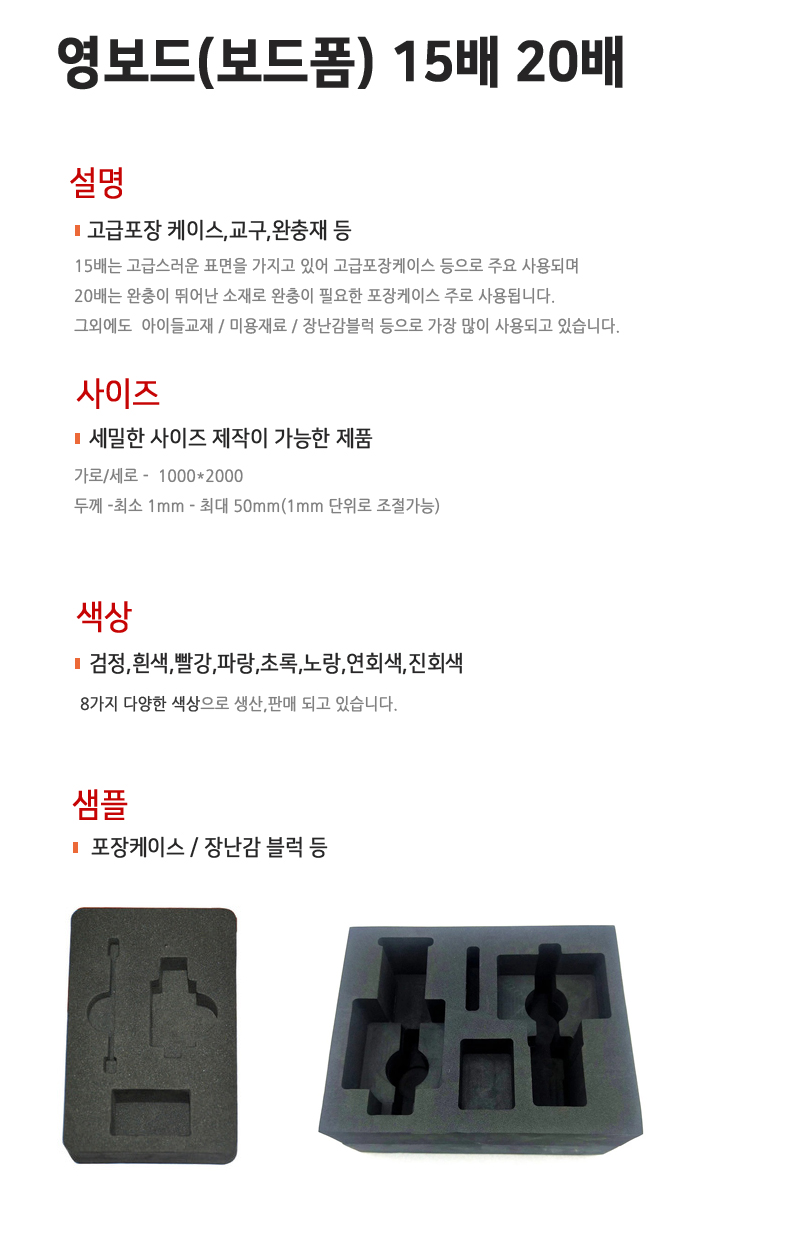 15배는 고급스러운 표면을 가지고 있어 고급 포장 케이스로 주요 사용되며, 20배는 완충이 뛰어난 소재로 완충이 필요한 케이스에 사용됩니다.