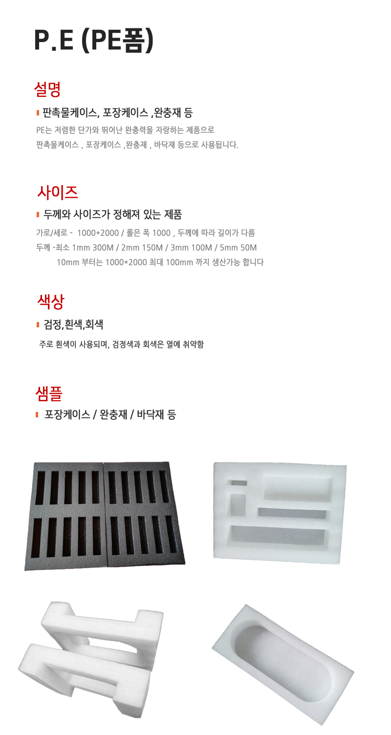 PE는 저렴한 단가와 뛰어난 완충력을 자랑하는 제품으로 판촉물 케이스, 포장 케이스, 완충재, 바닥재 등으로 사용됩니다.