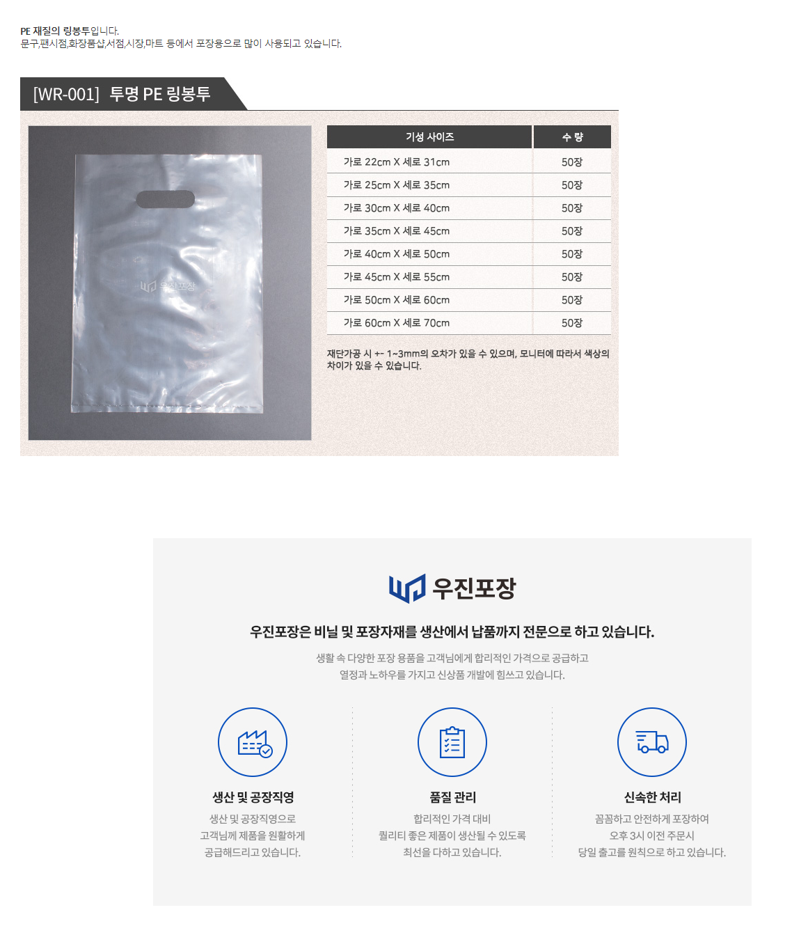 당사는 고객의 용도와 목적에 맞춰 다양한 종류와 규격의 PE링봉투를 제공하고 있습니다.