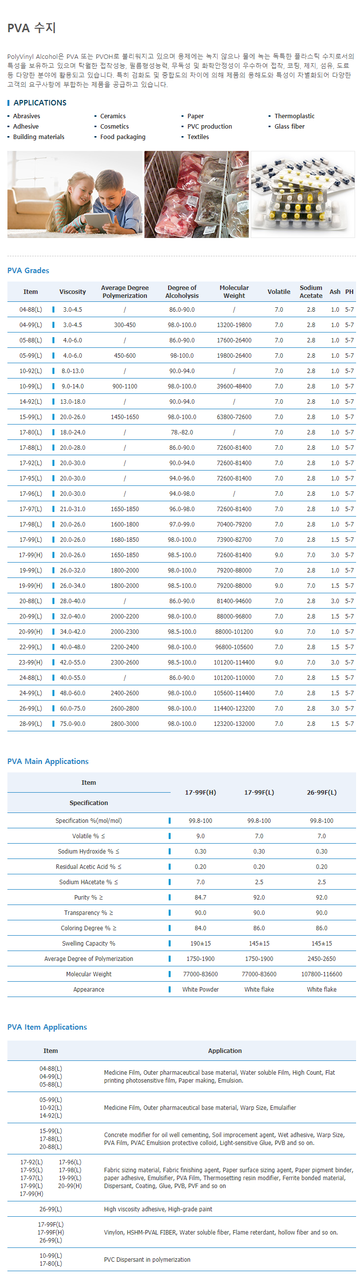PolyVinyl Alcohol은 PVA 또는 PVOH로 불리워지고 있으며 용제에는 녹지 않으나 물에 녹는 독특한 플라스틱 수지로서의 특성을 보유하고 있습니다.