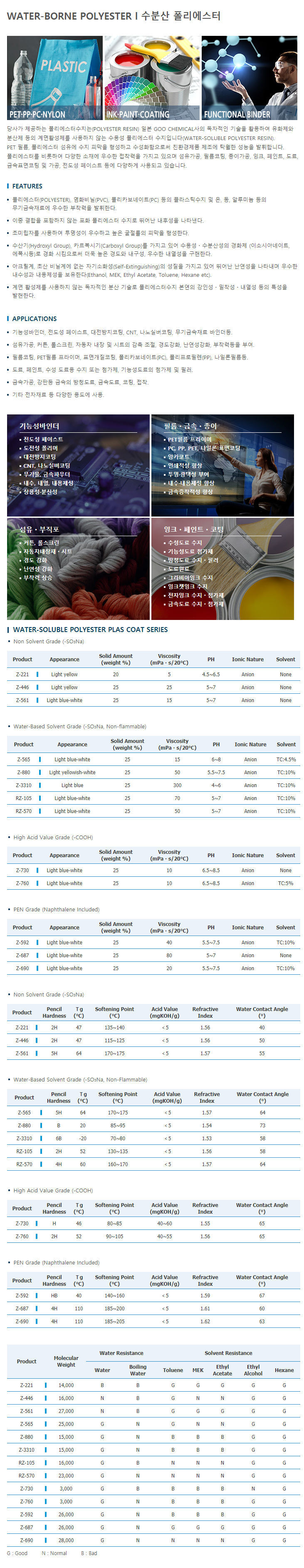 기능성 바인더, 섬유가공, 필름코팅, 도료, 금속가공