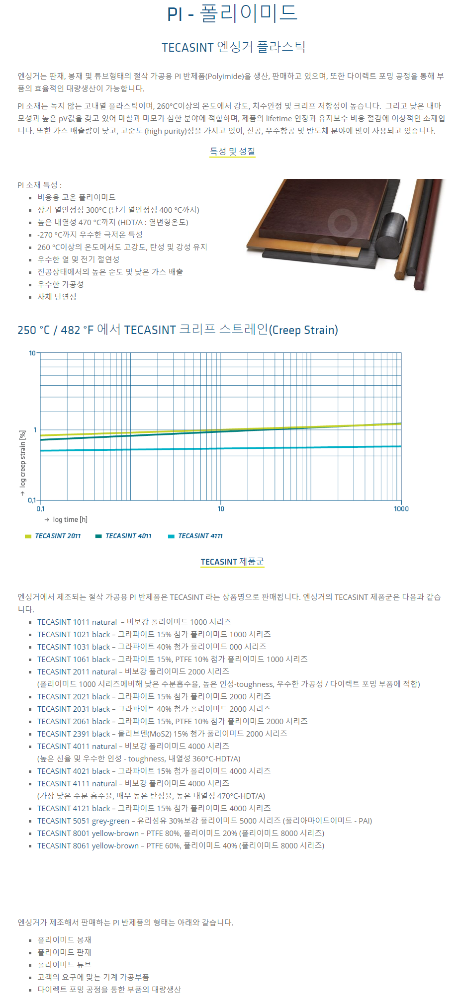엔싱거는 판재, 봉재 및 튜브형태의 절삭 가공용 PI 반제품(Polyimide)을 생산, 판매하고 있으며, 또한 다이렉트 포밍 공정을 통해 부품의 효율적인 대량생산이 가능합니다.