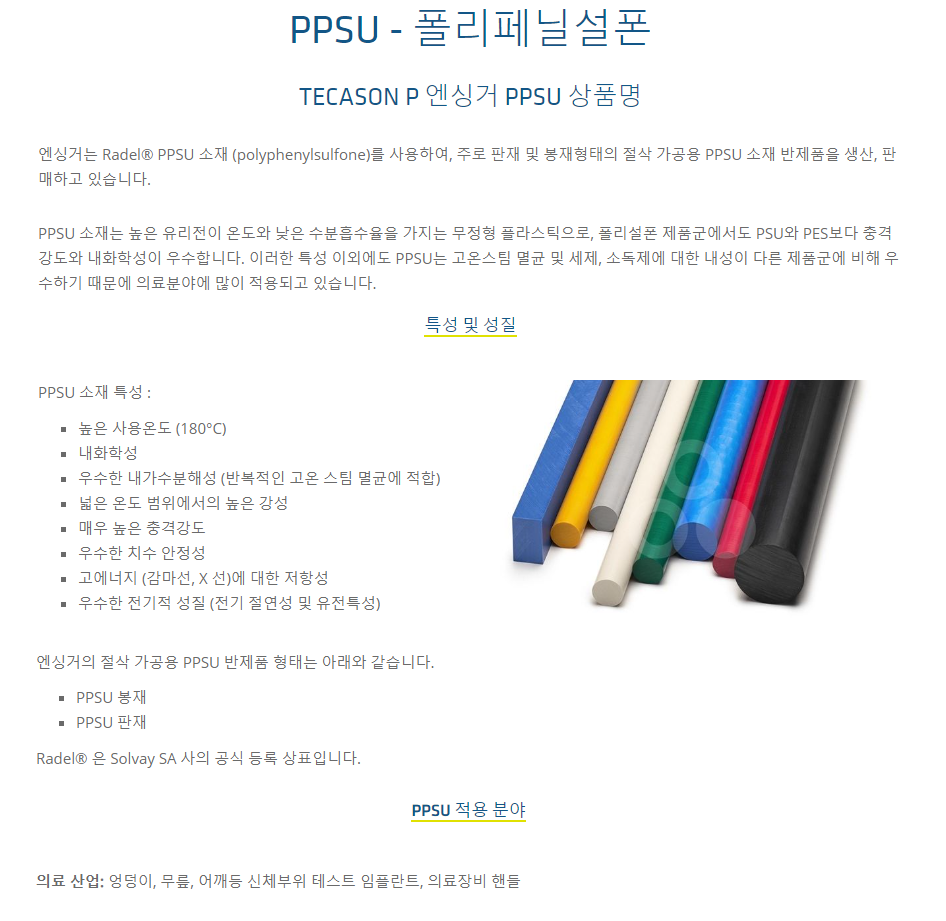 엔싱거는 Radel® PPSU 소재 (polyphenylsulfone)를 사용하여, 주로 판재 및 봉재형태의 절삭 가공용 PPSU 소재 반제품을 생산, 판매하고 있습니다.