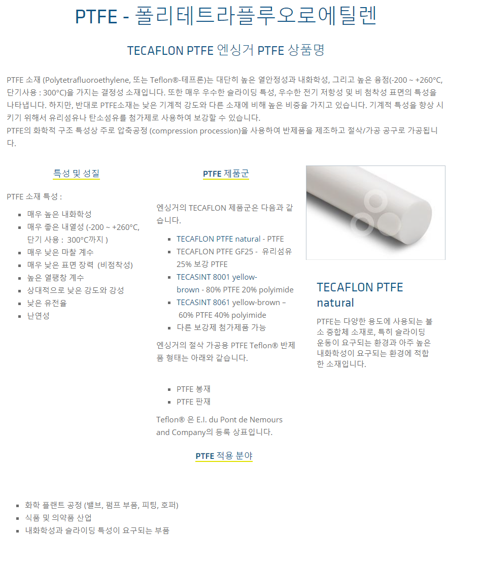 PTFE 소재 (Polytetrafluoroethylene, 또는 Teflon®-테프론)는 대단히 높은 열안정성과 내화학성, 그리고 높은 융점(-200 ~ +260°C, 단기사용 : 300°C)을 가지는 결정성 소재입니다.