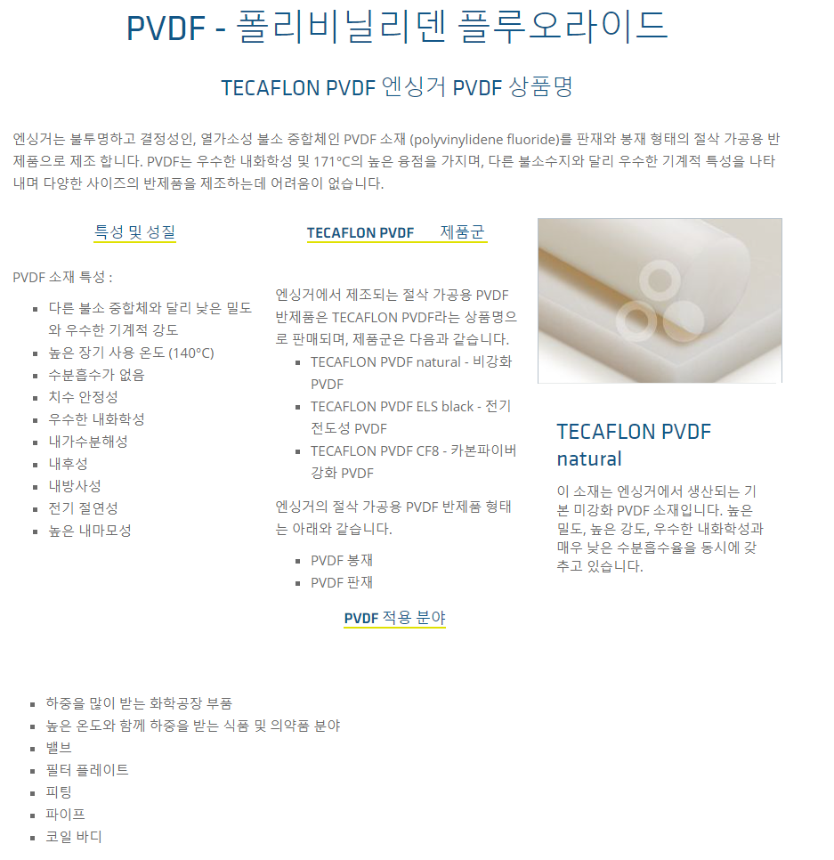 엔싱거는 불투명하고 결정성인, 열가소성 불소 중합체인 PVDF 소재 (polyvinylidene fluoride)를 판재와 봉재 형태의 절삭 가공용 반제품으로 제조 합니다.