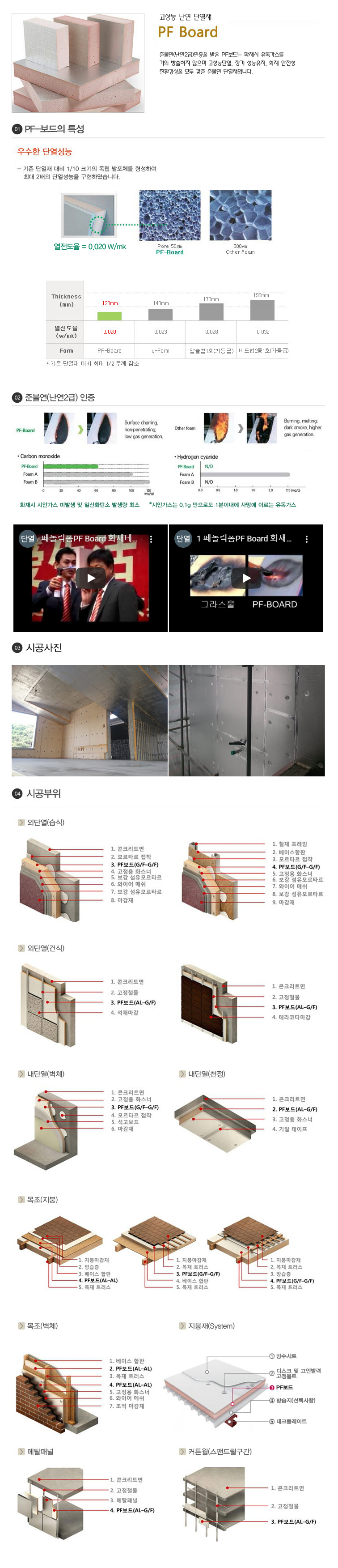 PF 보드는 화재시 유독가스를 거의 방출하지 않으며 고성능단열, 장기 성능유지, 화재 안전성, 친환경성을 모두 갖춘 준불연 단열재입니다.