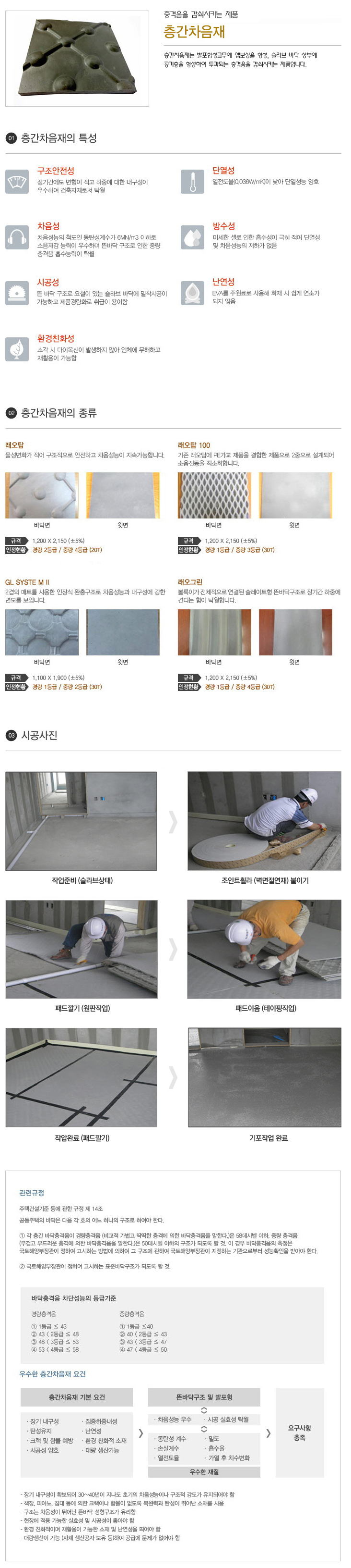 층간차음재는 발포합성고무에 엠보싱을 형성, 슬라브 바닥 상부에 공기층을 형성하여 투과되는 충격음을 감쇠시키는 제품입니다.