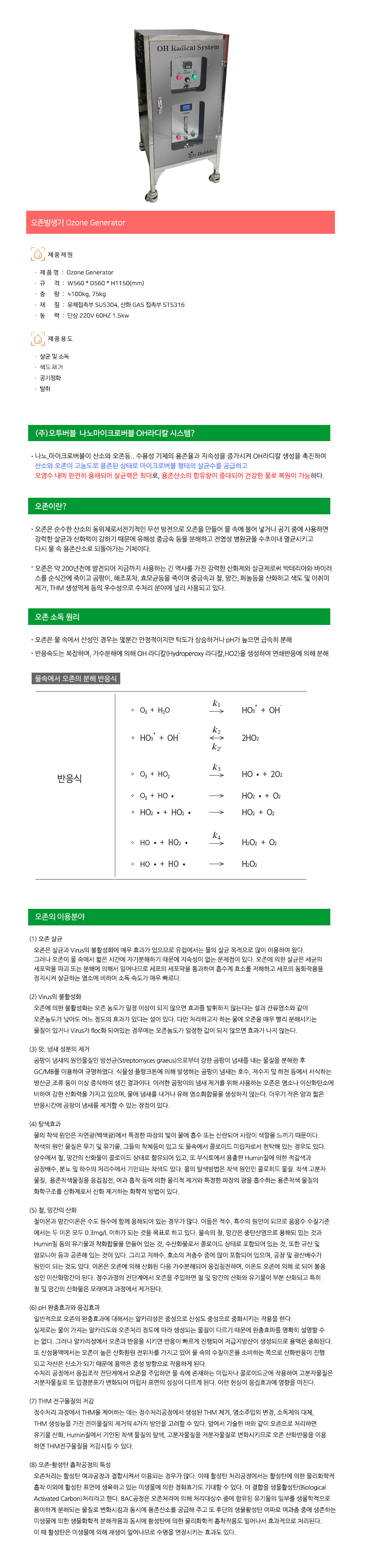 산소와 오존이 고농도로 용존된 상태로 마이크로버블 형태의 살균수를 공급하고 오셤수 내에 완전히 용해되어 살균력은 최대로, 용존산소의 함유량이 증대되어 건강한 물로 복원이 가능합니다.