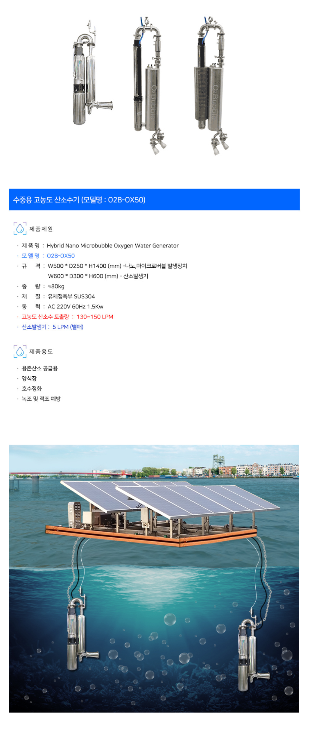 용존산소 공급용, 양식장, 호수정화, 녹조, 적조 예방 등 다양한 용도로 사용되는 수중 용존산소 공급장치입니다.