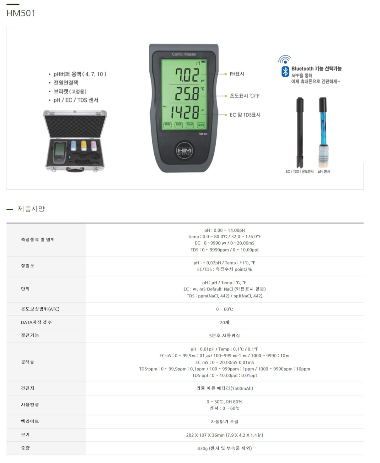 pH, 온도, EC, TDS 등 다양한 측정이 가능한 수질 측정기입니다.