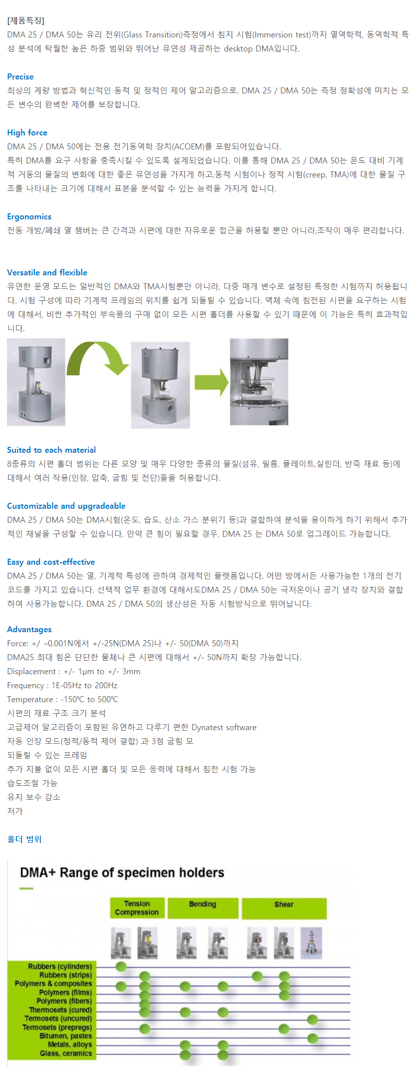 DMA 25 / DMA 50는 유리 전위(Glass Transition)측정에서 침지 시험(Immersion test)까지 열역학적, 동역학적 특성 분석에 탁월한 높은 하중 범위와 뛰어난 유연성 제공하는 desktop DMA입니다.