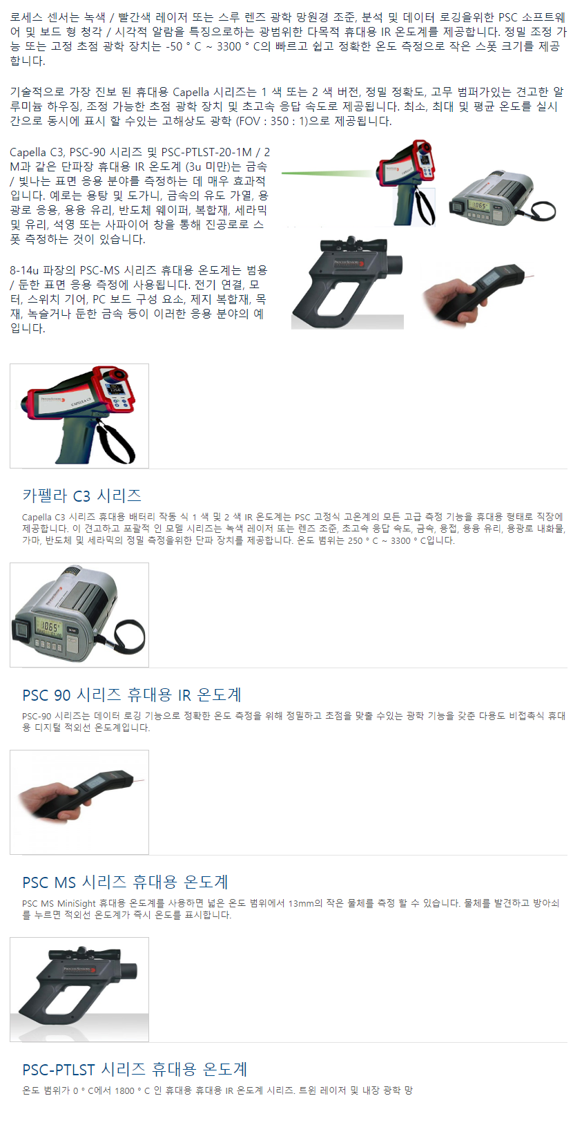 모델 시리즈는 녹색 레이저 또는 렌즈 조준, 초고속 응답 속도, 금속, 용접, 용융 유리, 용광로 내화물, 가마, 반도체 및 세라믹의 정밀 측정을위한 단파 장치를 제공합니다. 온도 범위는 250°C ~ 3300°C입니다.