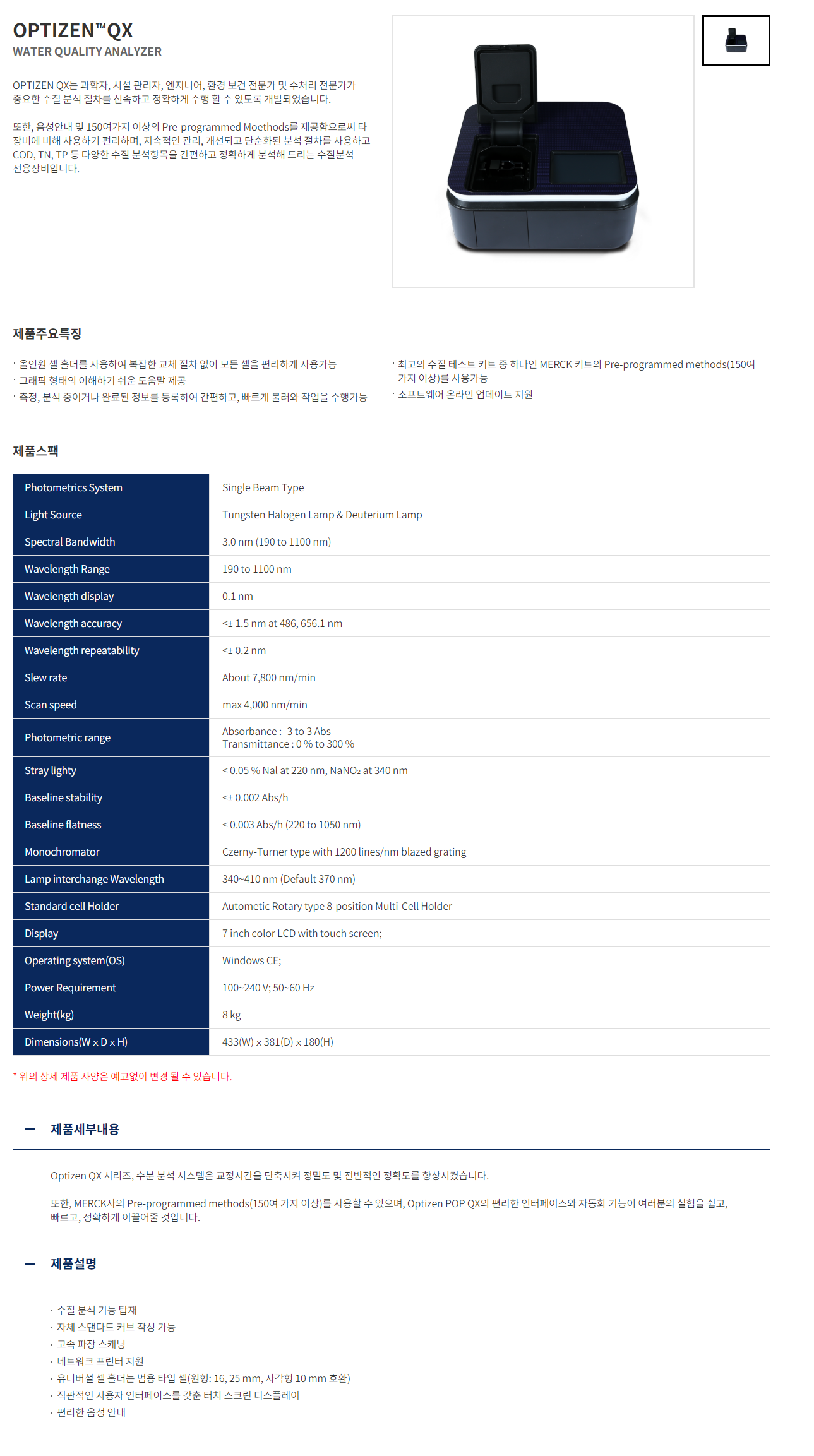 OPTIZEN QX는 과학자, 시설 관리자, 엔지니어, 환경 보건 전문가 및 수처리 전문가가 중요한 수질 분석 절차를 신속하고 정확하게 수행 할 수 있도록 개발되었습니다.