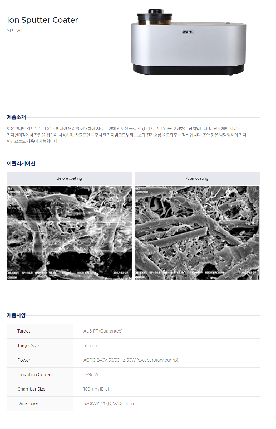 이온코터인 SPT-20은 DC 스퍼터링 원리를 이용하여 시료 표면에 전도성 물질(Au,Pt,Pd,Pt-Pd)을 코팅하는 장치입니다.
