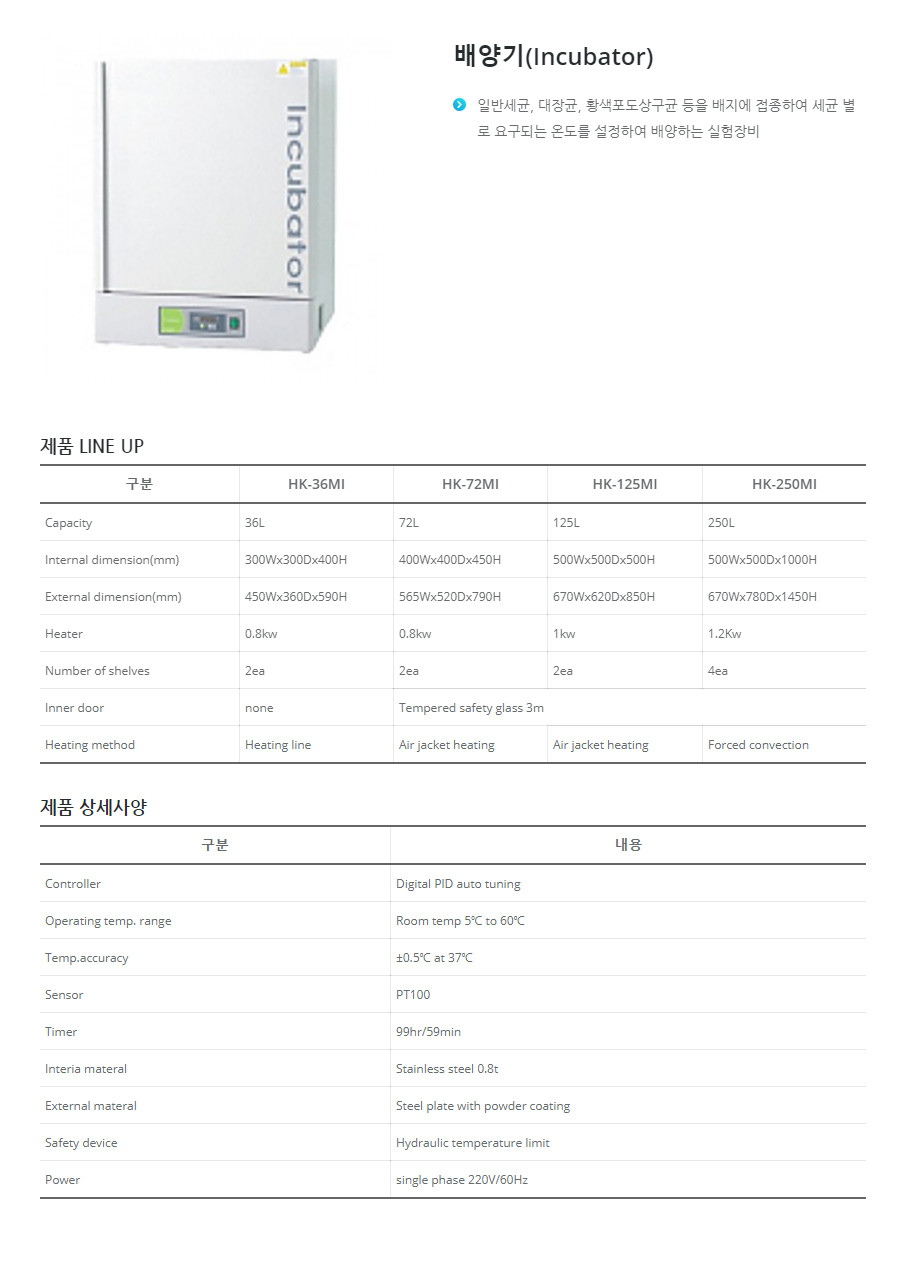 일반세균, 대장균, 황색포도상구균 등을 배지에 접종하여 세균 별로 요구되는 온도를 설정하여 배양하는 실험장비입니다.
