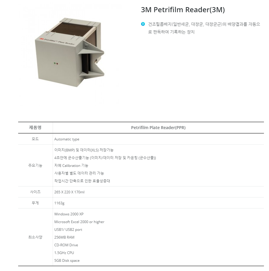 건조필름배지(일반세균, 대장균, 대장균군)의 배양결과를 자동으로 판독하여 기록하는 장치입니다.