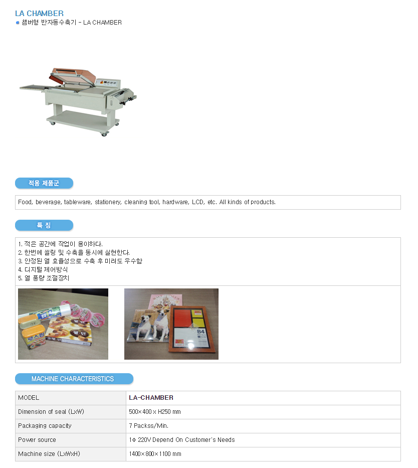 적은 공간에 작업이 용이하며, 한번에 씰링 및 수축을 동시에 실현합니다. 안정된 열 효율성으로 수축 후 미려도 우수합니다.
