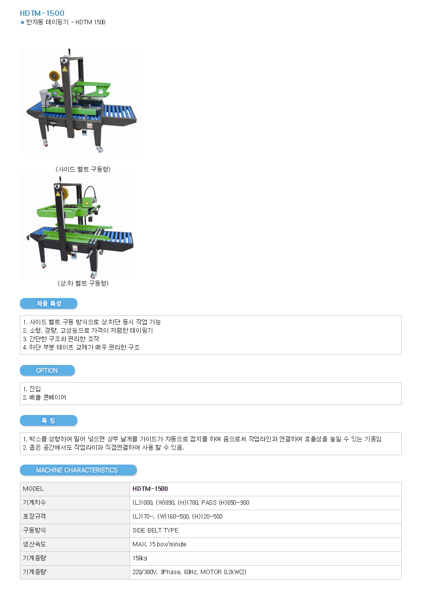 박스를 성형하여 밀어 넣으면 상부 날개를 가이드가 자동으로 접지를 하여 줌으로써 작업라인과 연결하여 효율성을 높일 수 있는 기종입니다.
