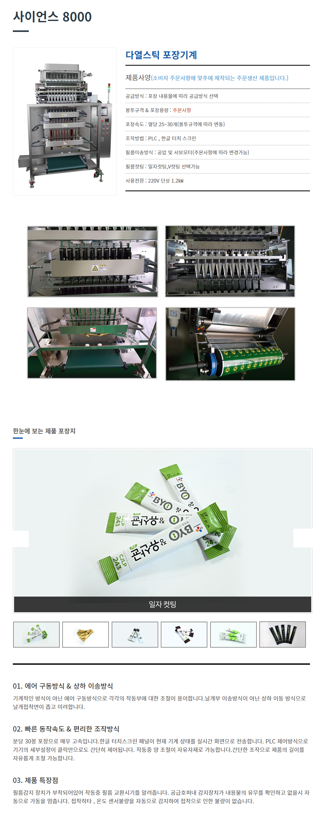 분당 30봉 포장으로 매우 고속입니다.한글 터치스크린 패널이 현재 기계 상태를 실시간 화면으로 전송합니다. PLC 제어방식으로 기기의 세부설정이 클릭만으로도 간단히 제어됩니다.