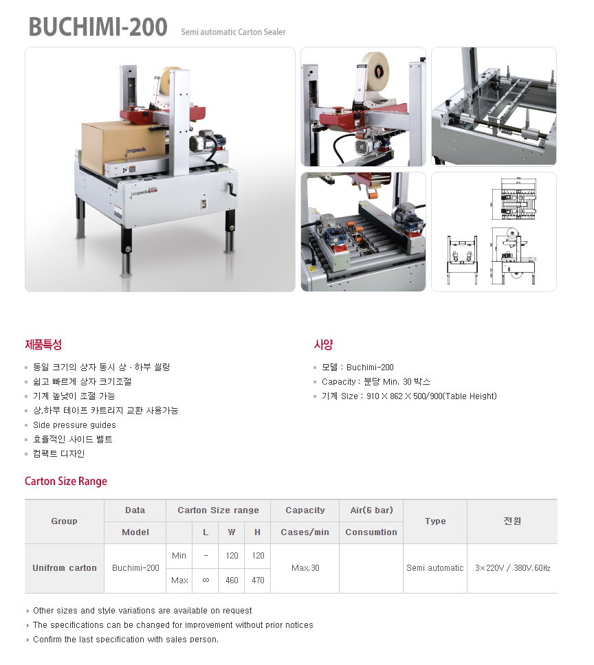 분당 30 박스의 씰링이 가능한 제품으로, 동일 크기의 상자 동시 상ㆍ하부 씰링이 가능합니다. 쉽고 빠르게 상자 크기조절이 가능합니다.