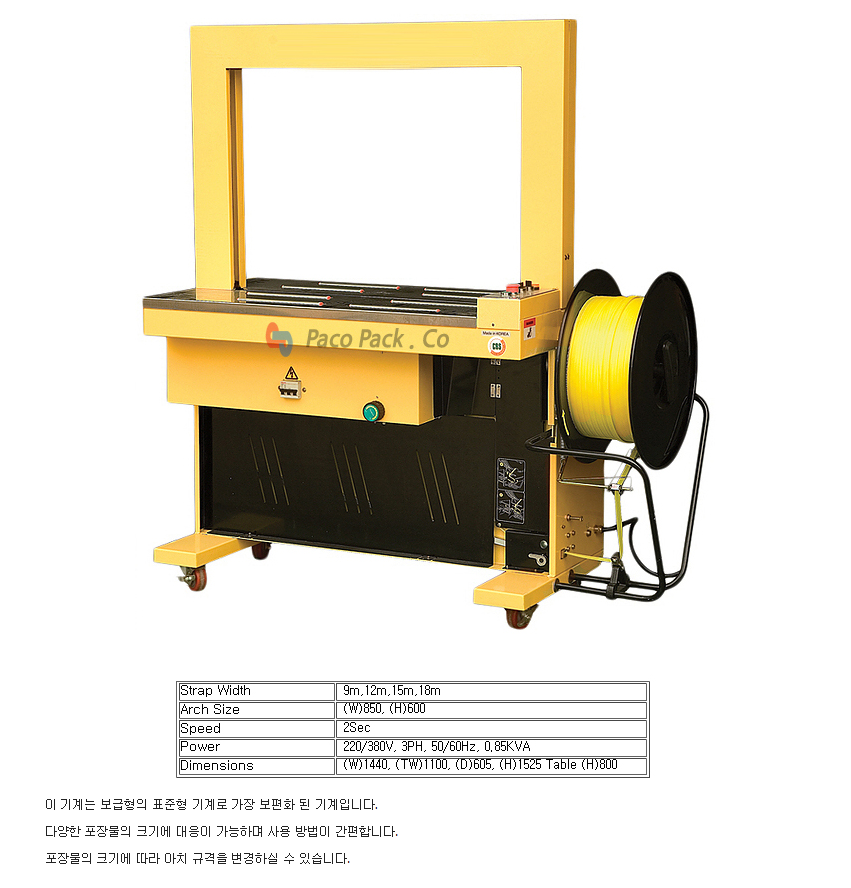 이 기계는 보급형의 표준형 기계로 가장 보편화 된 기계입니다. 다양한 포장물의 크기에 대응이 가능하며 사용 방법이 간편합니다.