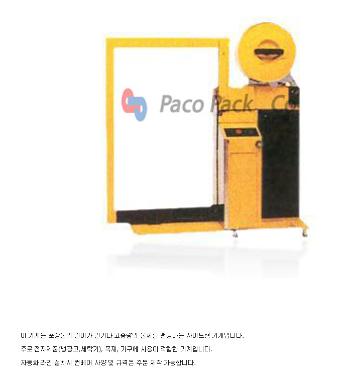 이 기계는 포장물의 길이가 길거나 고중량의 물체를 밴딩하는 사이드형 기계입니다.주로 전자제품(냉장고,세탁기), 목재, 가구에 사용이 적합한 기계입니다.