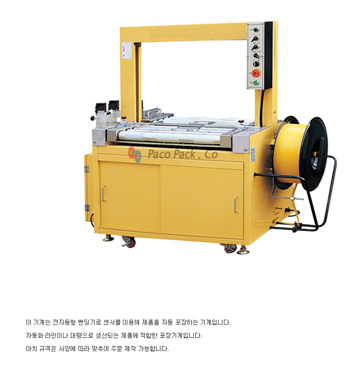 이 기계는 전자동형 밴딩기로 센서를 이용해 제품을 자동 포장하는 기계입니다. 자동화 라인이나 대량으로 생산되는 제품에 적합한 포장기계입니다.