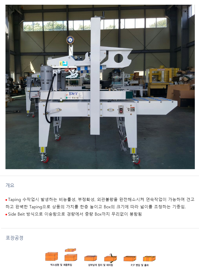 Taping 수작업시 발생하는 비능률성, 부정확성, 외관불량을 완전해소시켜 연속작업이 가능하며 견고하고 완벽한 Taping으로 상품의 가치를 한층 높이고 Box의 크기에 따라 넓이를 조정하는 기종입니다.