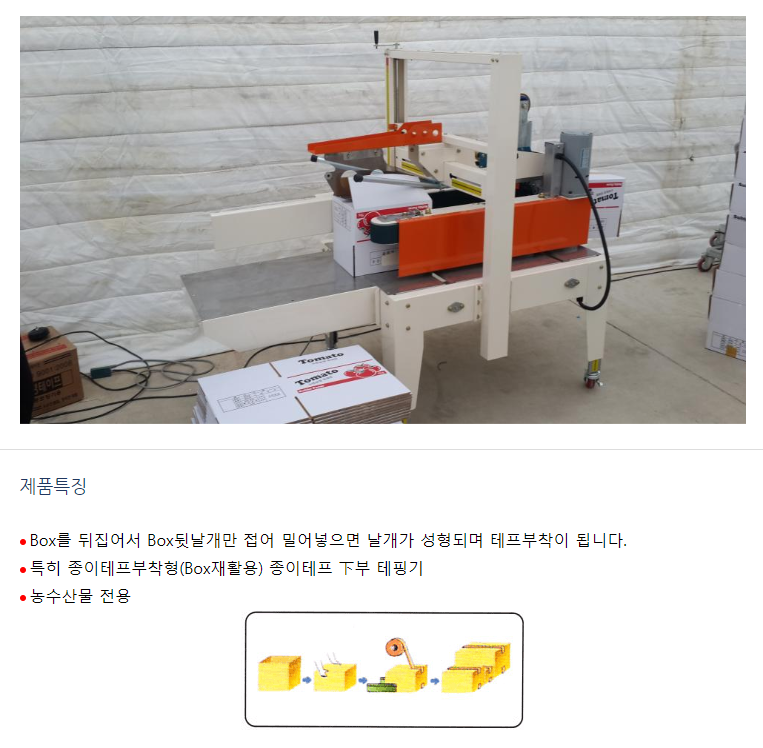 Box를 뒤집어서 Box뒷날개만 접어 밀어넣으면 날개가 성형되며 테프부착이 됩니다. 특히 종이테프부착형(Box재활용) 종이테프 下부 테핑기로서 농수산물에서 주로 사용됩니다.