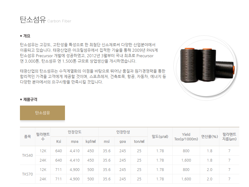 태광산업의 탄소섬유는 수직계열화의 이점을 바탕으로 뛰어난 품질과 원가경쟁력을 통한 합리적인 가격을 고객에게 제공할 것이며, 스포츠레저, 건축토목, 항공, 자동차, 에너지 등 다양한 분야에서의 요구사항을 만족시킬 것입니다.