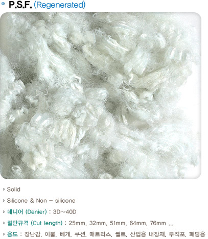 장난감, 이불, 베개, 쿠션, 매트리스, 퀼트, 산업용 내장재, 부직포, 패딩용으로 사용되는 PSF 재생섬유입니다.