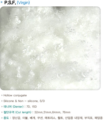 장난감, 이불, 베개, 쿠션, 매트리스, 퀼트, 산업용 내장재, 부직포, 패딩용으로 사용되는 PSF 재생섬유입니다.