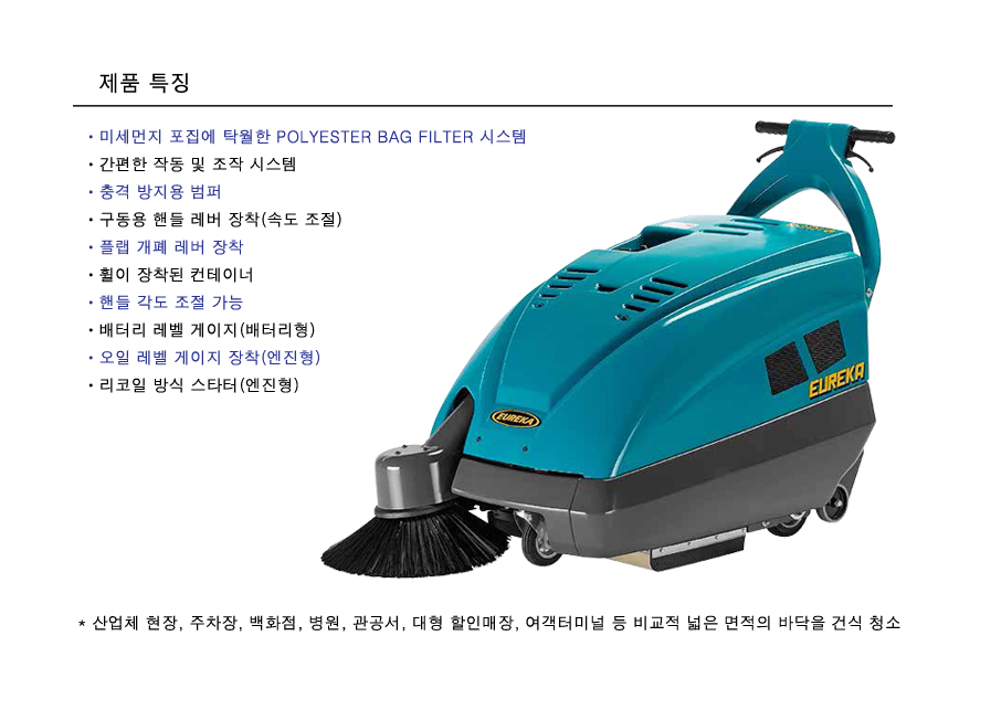 산업체 현장, 주차장, 백화점, 병원, 관공서, 대형 할인매장, 여객터미널 등 비교적 넓은 면적의 바닥을 건식 청소하기에 적합한 제품입니다.