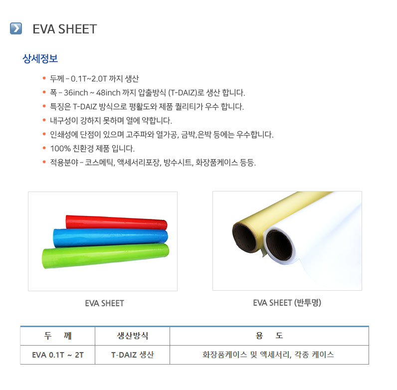 T-DAIZ 방식으로 평활도와 제품 퀄리티가 우수합니다. 내구성이 강하지 못하며 열에 약합니다. 인쇄성에 단점이 있으며 고주파와 열가공, 금박, 은박 등에는 우수합니다.