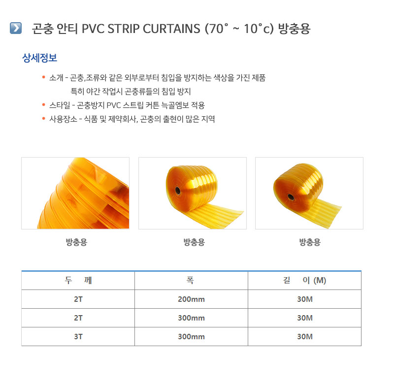 곤충, 조류와 같은 외부로부터 침입을 방지하는 색상을 가진 제품으로, 곤충방지 PVC 스트립 커튼 늑골엠보를 적용했습니다.