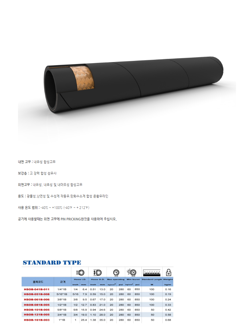 내면 고무가 내유성 합성고무로 된 오일 호스로, 광물성,난연성,수성계 작동유,탄화수소계 합성 윤활유라인 용도로 사용됩니다.