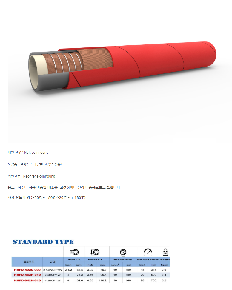내면 고무가 NBR compound로 된 식수, 식품용 호스로, 식수나 식품 이송및 배출용. 고추장이나 된장 이송용 용도로 사용됩니다.