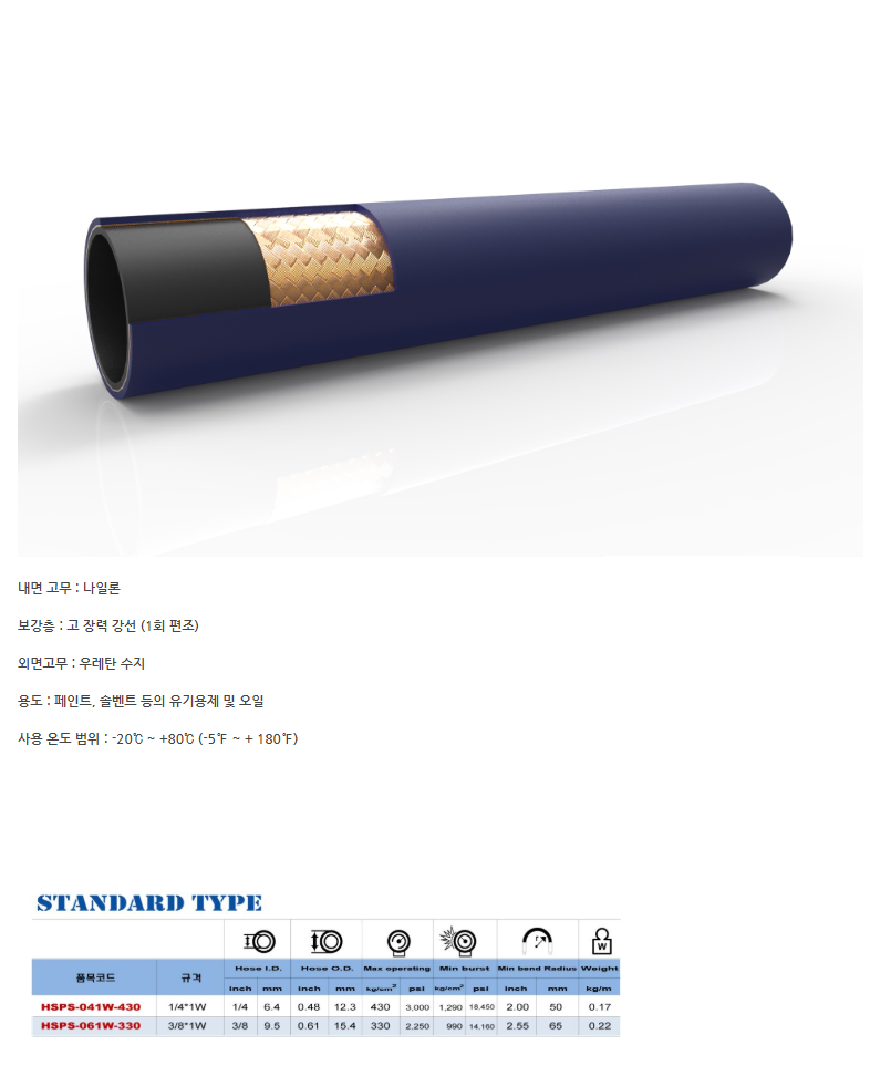 내면 고무가 나일론으로 된 페인트 스프레이 호스로, 페인트, 솔벤트 등의 유기용제 및 오일 용도로 사용됩니다.