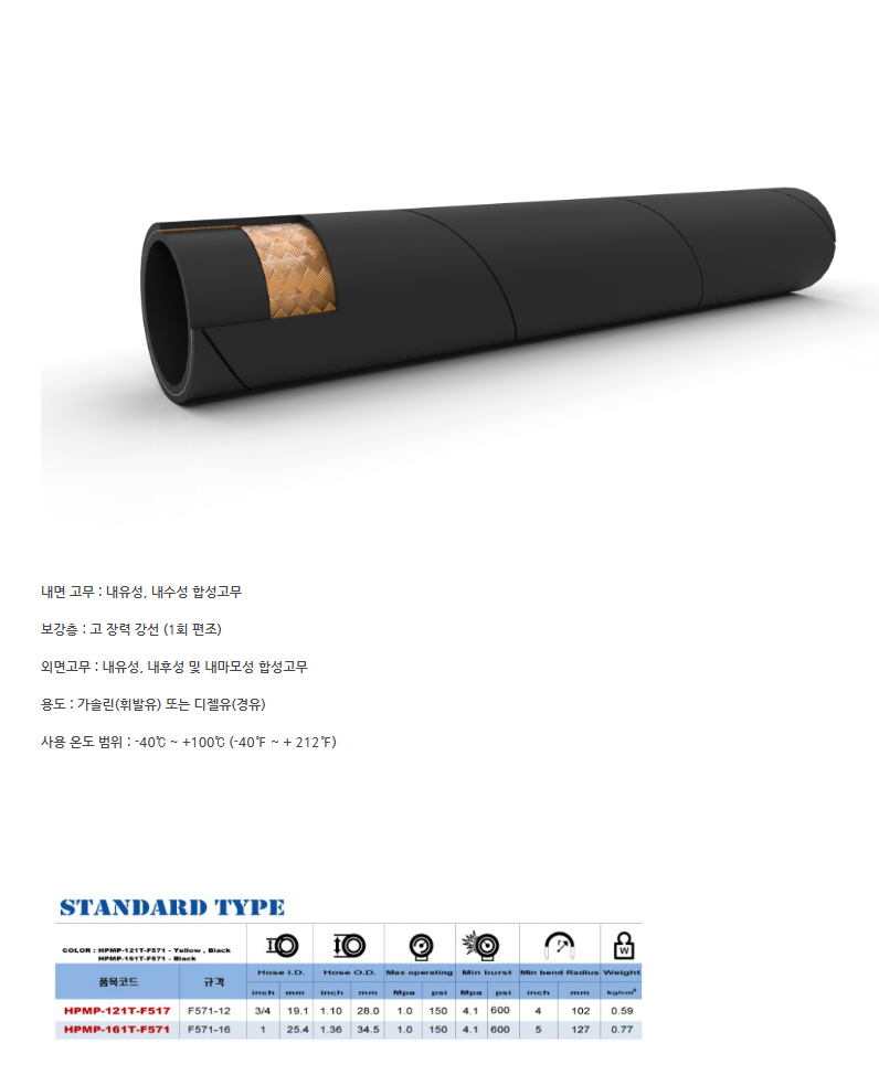 내면 고무가 내유성, 내수성 합성고무로 된 주유기 호스로, 가솔린(휘발유) 또는 디젤유(경유) 이송 용도로 사용됩니다.