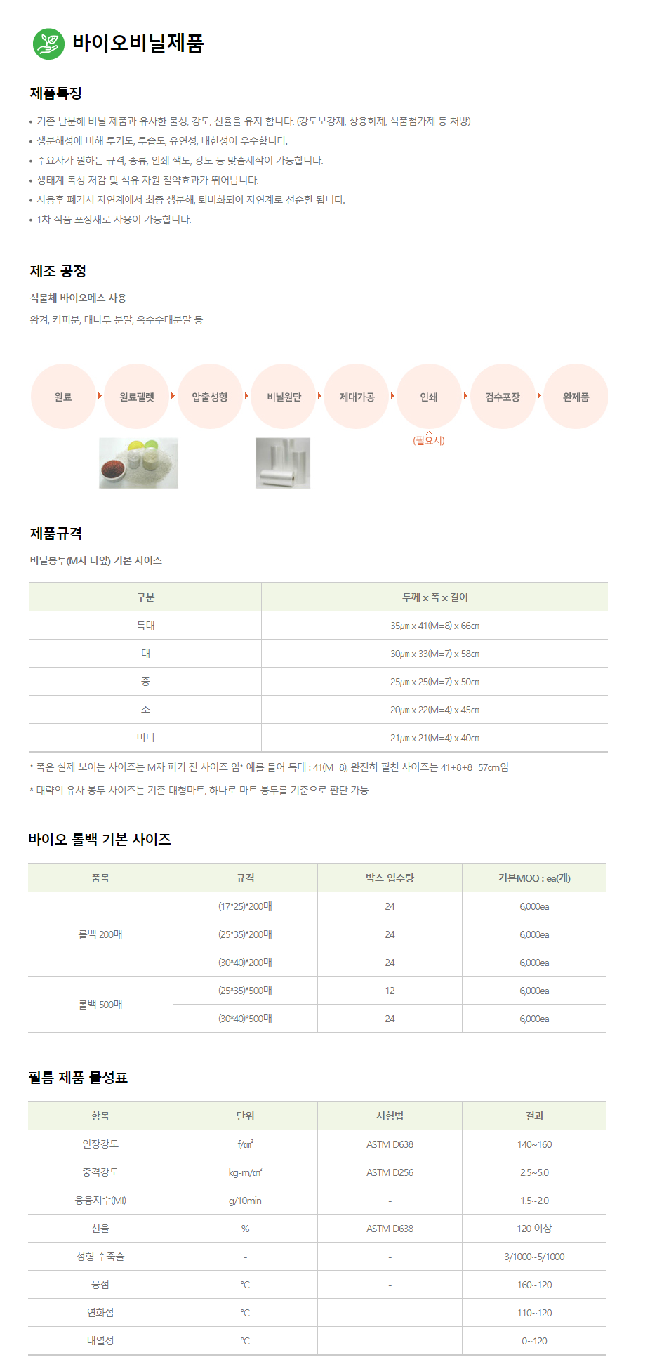 기존 난분해 비닐 제품과 유사한 물성, 강도, 신율을 유지 합니다. (강도보강재, 상용화제, 식품첨가제 등 처방) 수요자가 원하는 규격, 종류, 인쇄 색도, 강도 등 맞춤제작이 가능합니다.
