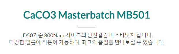 D50기준 800Nano사이즈의 탄산칼슘 마스터뱃치 입니다. 다양한 필름에 적용이 가능하며, 최고의 품질을 만나보실 수 있습니다.