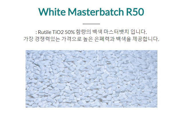 Rutile TiO2 50% 함량의 백색 마스터뱃치 입니다. 가장 경쟁력있는 가격으로 높은 은폐력과 백색을 제공합니다.