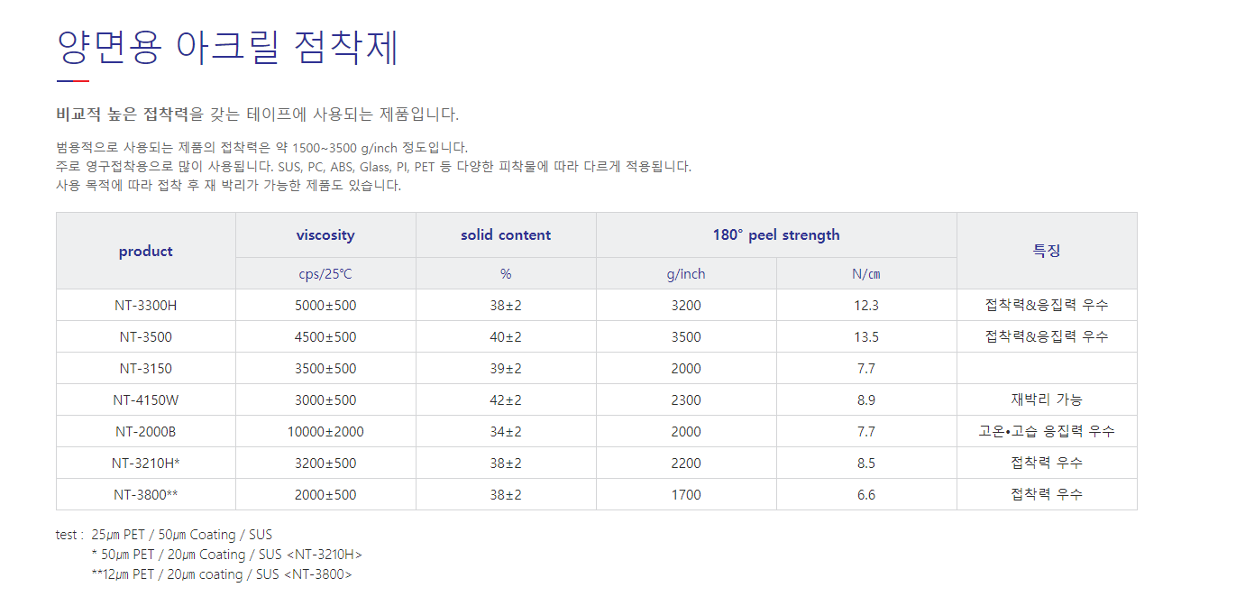 범용적으로 사용되는 제품의 접착력은 약 1500~3500 g/inch 정도입니다. 주로 영구접착용으로 많이 사용됩니다. SUS, PC, ABS, Glass, PI, PET 등 다양한 피착물에 따라 다르게 적용됩니다.