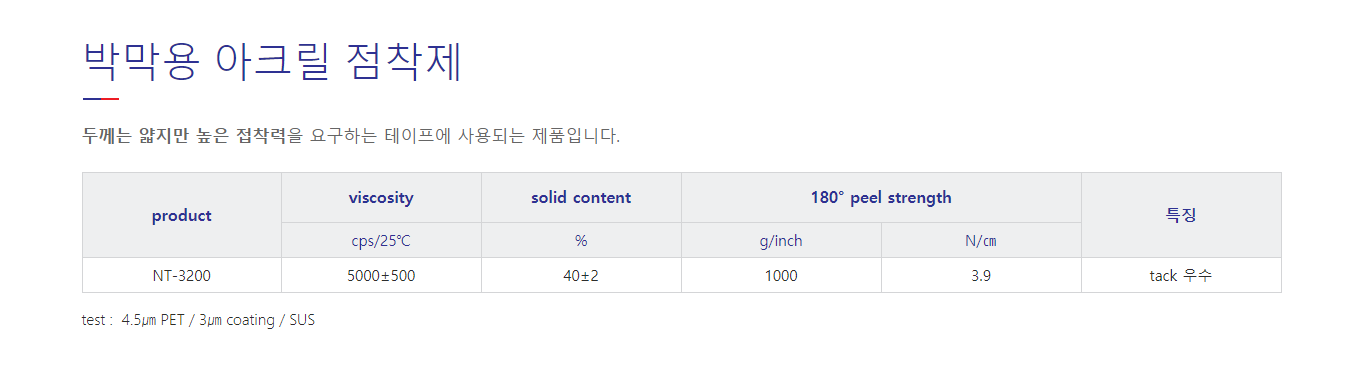 두께는 얇지만 높은 접착력을 요구하는 테이프에 사용되는 제품입니다.