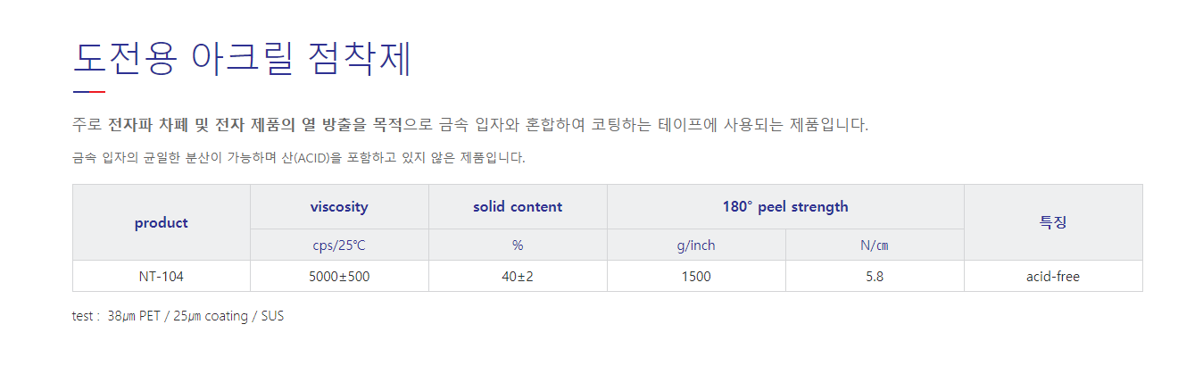 주로 전자파 차폐 및 전자 제품의 열 방출을 목적으로 금속 입자와 혼합하여 코팅하는 테이프에 사용되는 제품입니다.