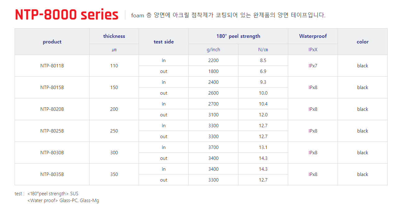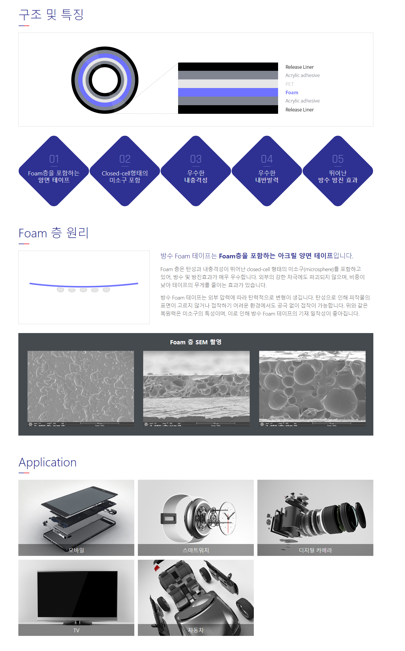 foam 층 양면에 아크릴 점착제가 코팅되어 있는 완제품의 양면 테이프입니다.