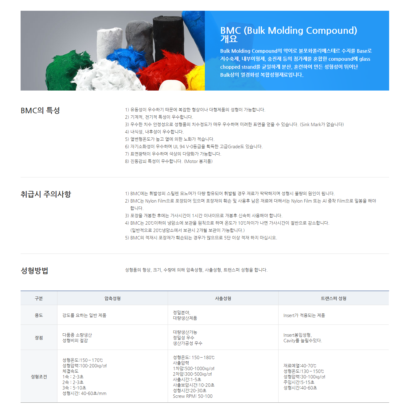그 외 특성 | Bulk Molding Compound의 약어로 불포화폴리에스테르 수지를 Base로 저수축제, 내부이형제, 충진재 등의 첨가제를 혼합한 compound에 glass chopped strand를 균일하게 분산, 혼련하여 만든 성형성이 뛰어난 Bulk상의 열경화성 복합성형재료입니다. |