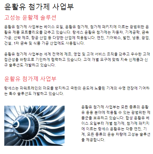 랑세스 윤활유 첨가제는 자동차, 기계공학, 금속가공, 선박 제조, 항공 산업 등 다양한 산업에 적용됩니다. 엔진, 기어박스, 발전, 냉동, 광업, 건설, 1차 금속 및 식품 가공 산업에도 사용됩니다.