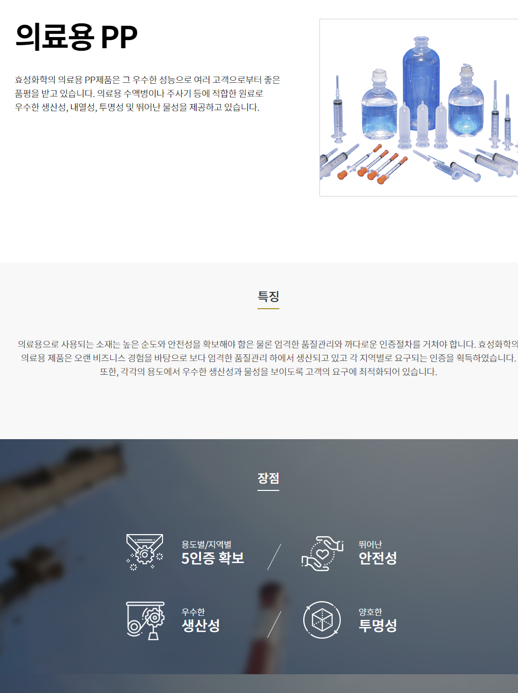 효성화학의 의료용 PP제품은 그 우수한 성능으로 여러 고객으로부터 좋은 품평을 받고 있습니다. 의료용 수액병이나 주사기 등에 적합한 원료로 우수한 생산성, 내열성, 투명성 및 뛰어난 물성을 제공하고 있습니다.