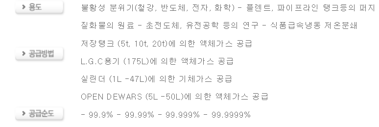 공기를 액화분리하여 제조하며 불활성 분위기 가스로 널리 이용됩니다.불활성, 불연성 특징이 있으며 질식, 구역, 구토 등을 유발할 수 있습니다.